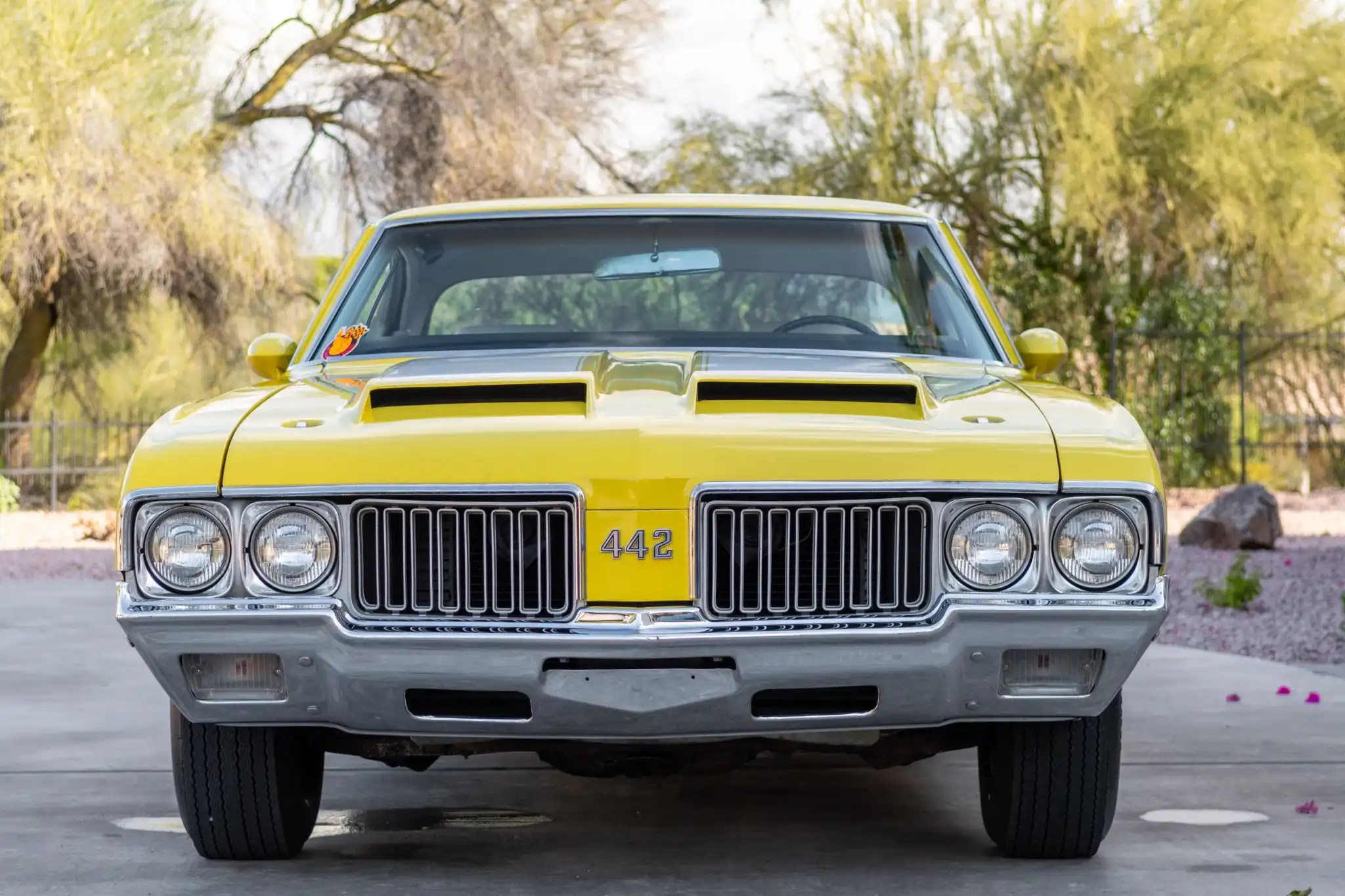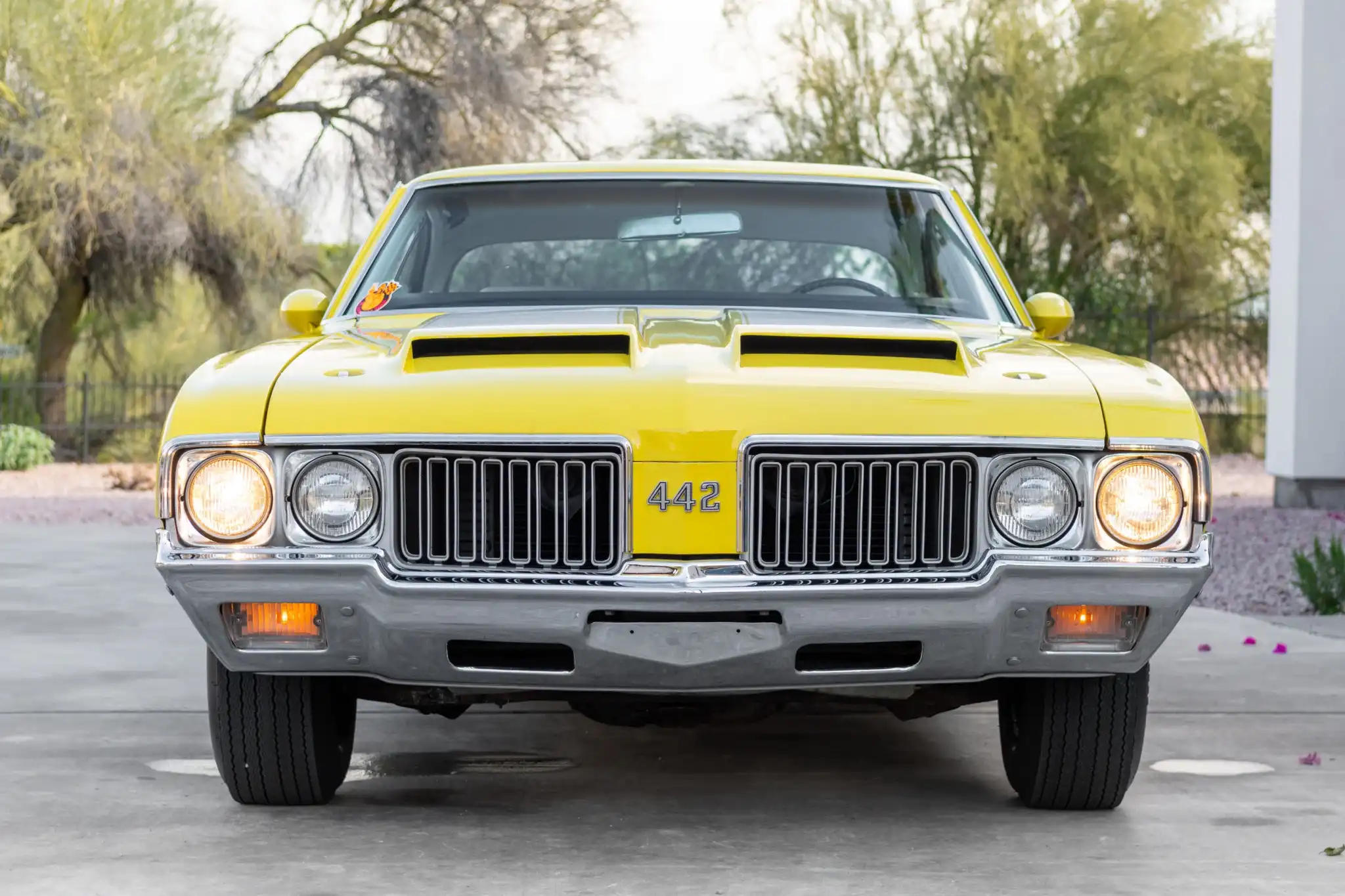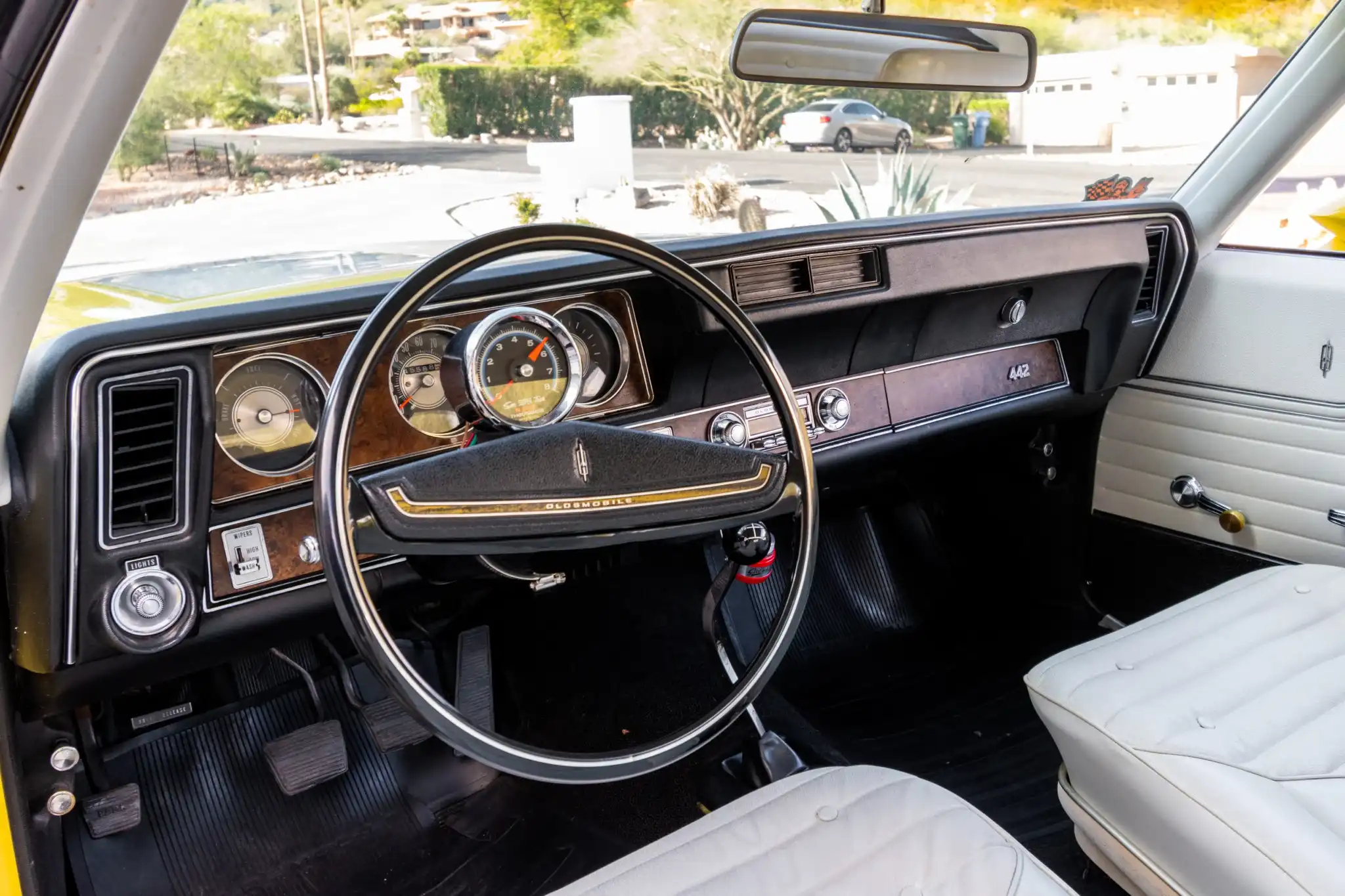 This 1970 Oldsmobile 442 coupe represents the pinnacle of GM’s muscle car era, factory-equipped with the legendary W30 performance package and powered by its numbers-matching 455ci V8 mated to a 4-speed manual transmission. Presented in its correct Sebring Yellow (51) with white W30 stripes over an Ivory vinyl interior (937), this rare and highly collectible 442 delivers authentic, documentable performance pedigree.