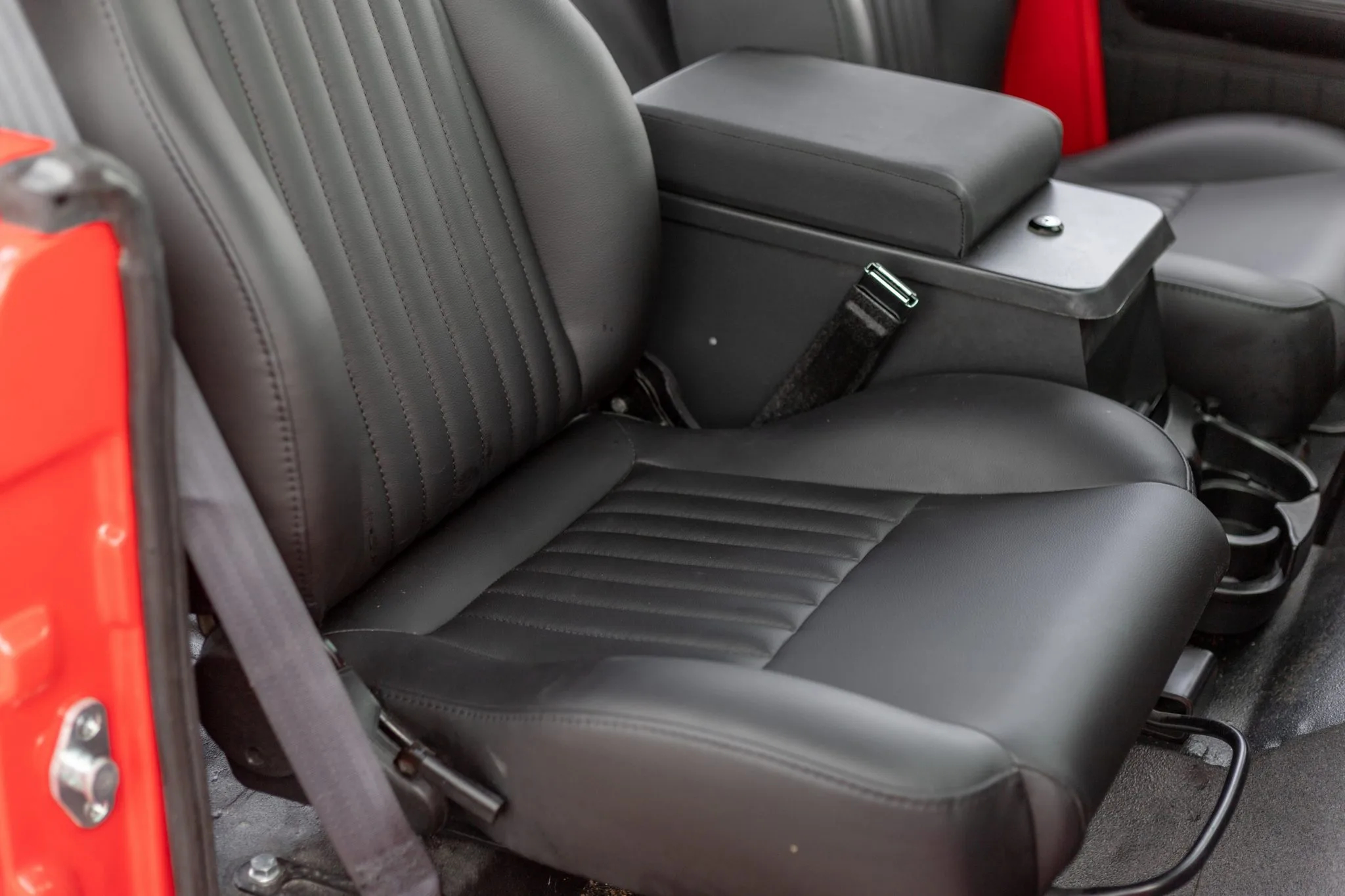 This 1976 Ford Bronco has been transformed into a high-performance off-road beast, blending modern Coyote V8 power with classic Bronco ruggedness. Built and modified by Badass Broncos of New Braunfels, Texas, this fully upgraded rig features a 5.0L Coyote engine, 6R80 six-speed automatic transmission, and premium off-road components, all wrapped in a striking red and black leather aesthetic.