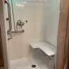 • Spacious Roll-In Shower with fold-down seat and grab bars throughout