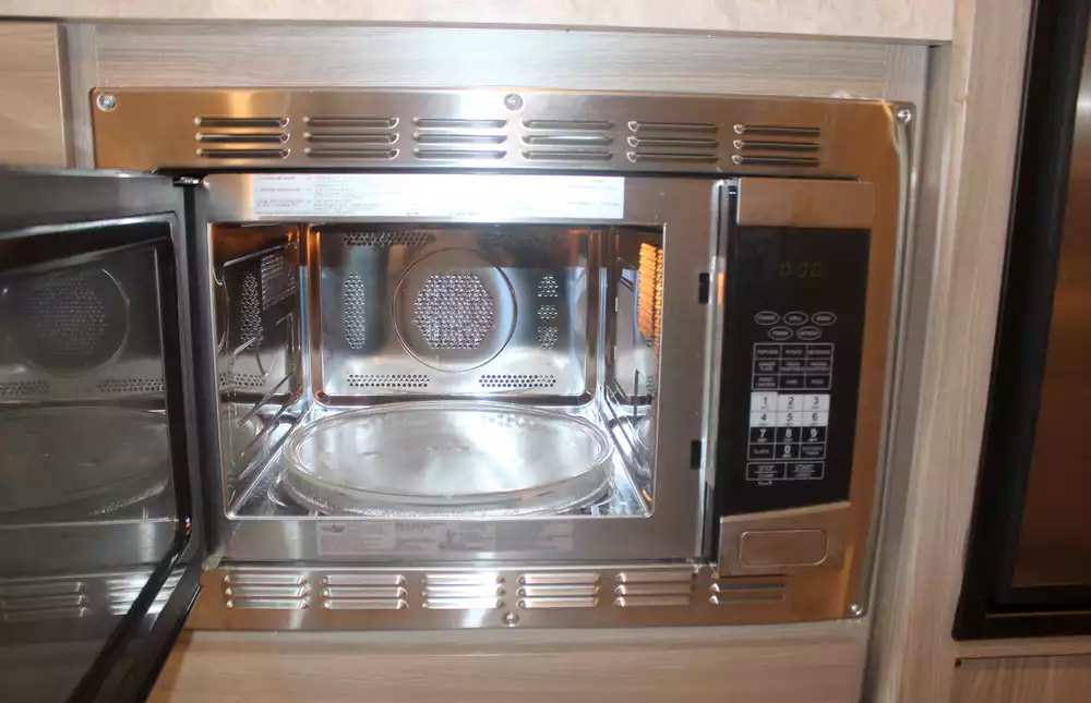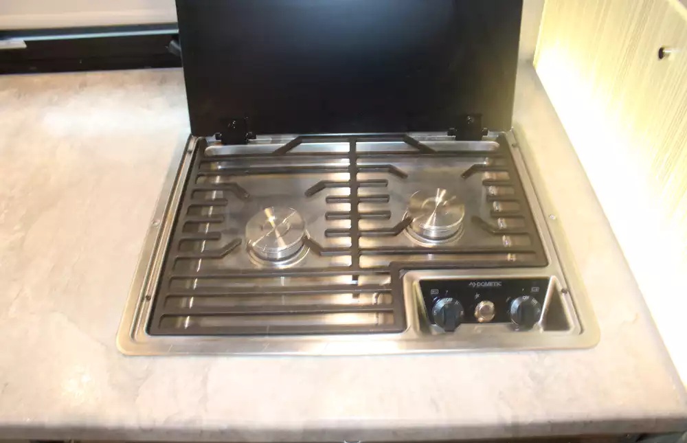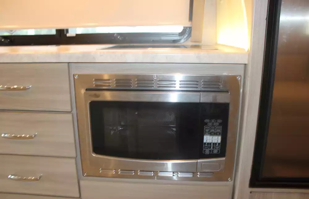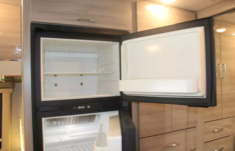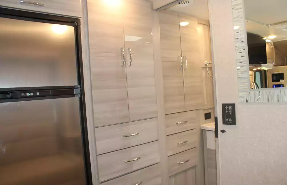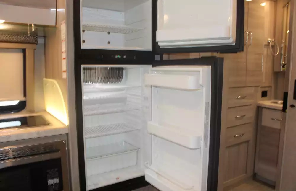 - Double door Norcold refrigerator (gas/110V) offers flexible cooling options