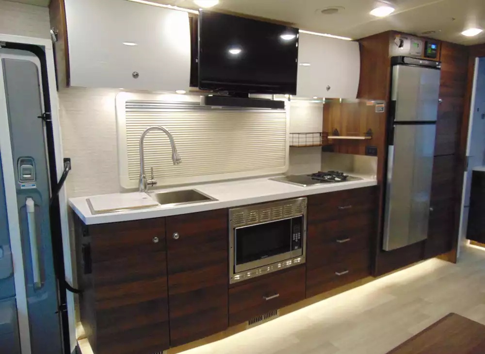 - Gourmet-inspired kitchen with 2-burner range and convection microwave